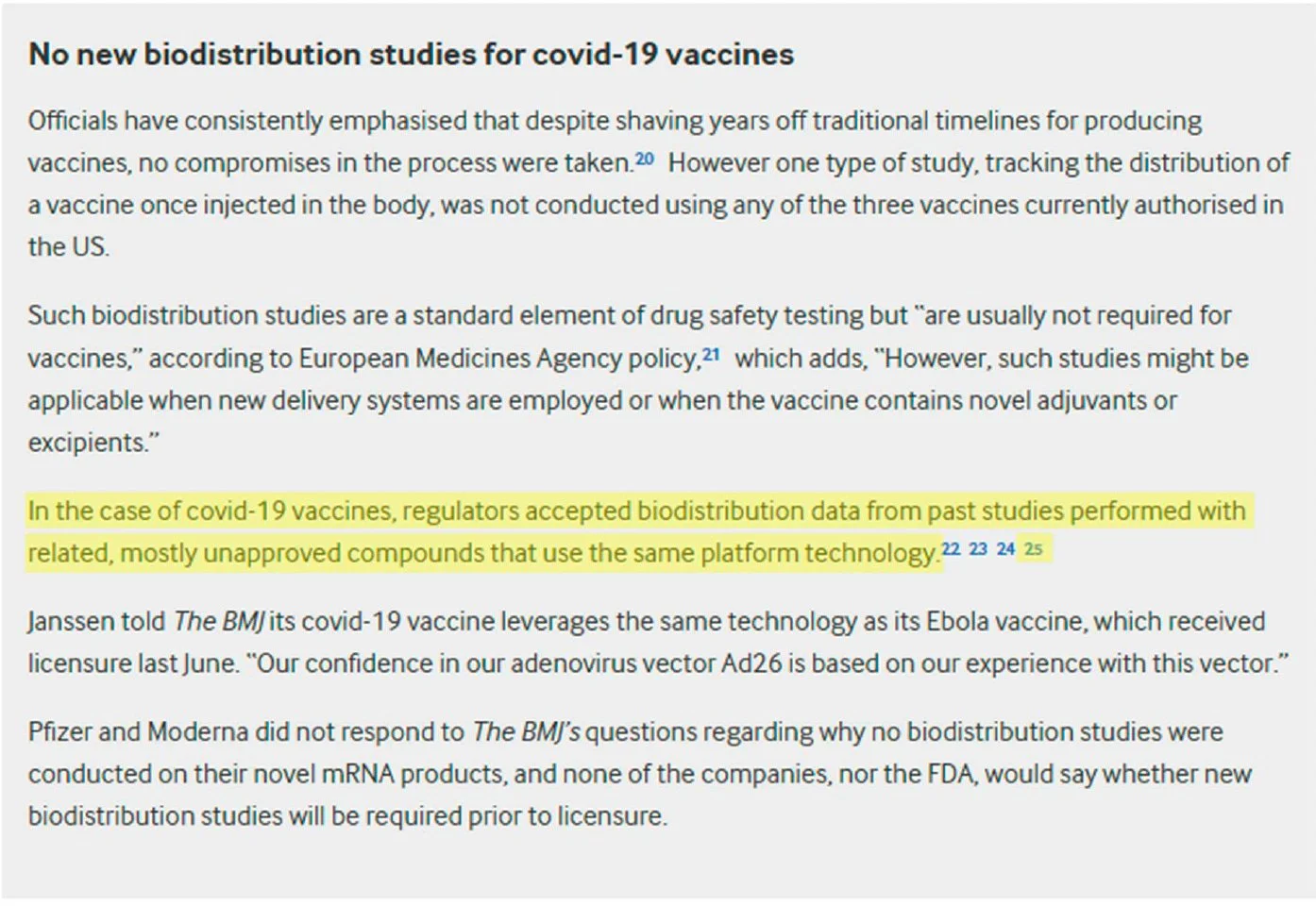 “A biodistribution study was not performed with mRNA-1273 vaccine. Results from the biodistribution study of a different vaccine… were submitted in support of Spikevax.”