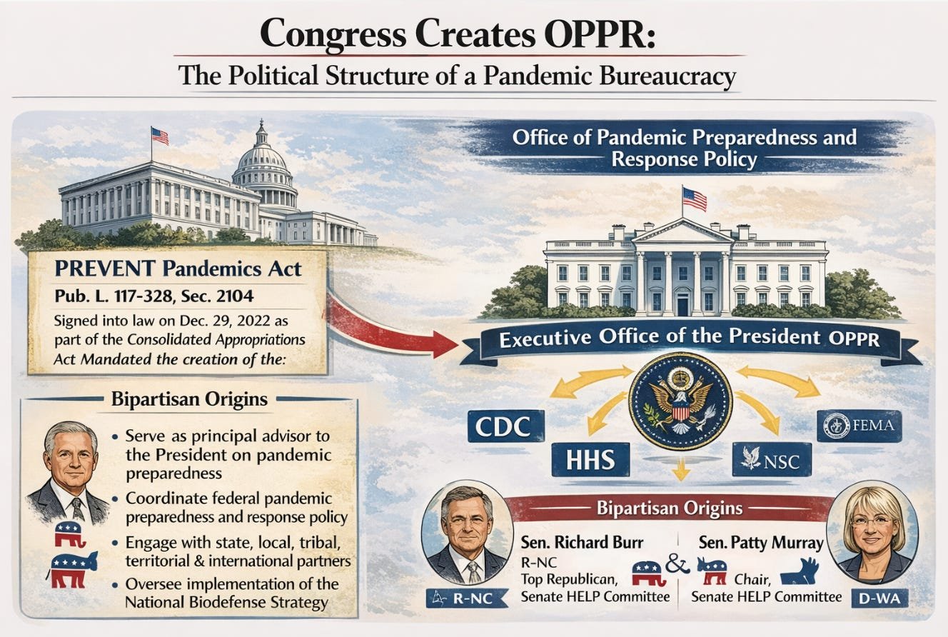 Congress’s response to the COVID-19 coordination catastrophe was the PREVENT Pandemics Act, signed into law in December 2022 as part of the omnibus appropriations bill. Section 2104 mandated the creation of the Office of Pandemic Preparedness and Response Policy within the Executive Office of the President, with a presidentially appointed director, biennial reporting obligations to Congress, and a five-year preparedness outlook. The Act reflected a genuine conservative public health tradition: the federal government has a legitimate role in maintaining readiness for catastrophic biological threats, just as it has a legitimate role in maintaining military readiness. Preparedness is not the same as intervention.
