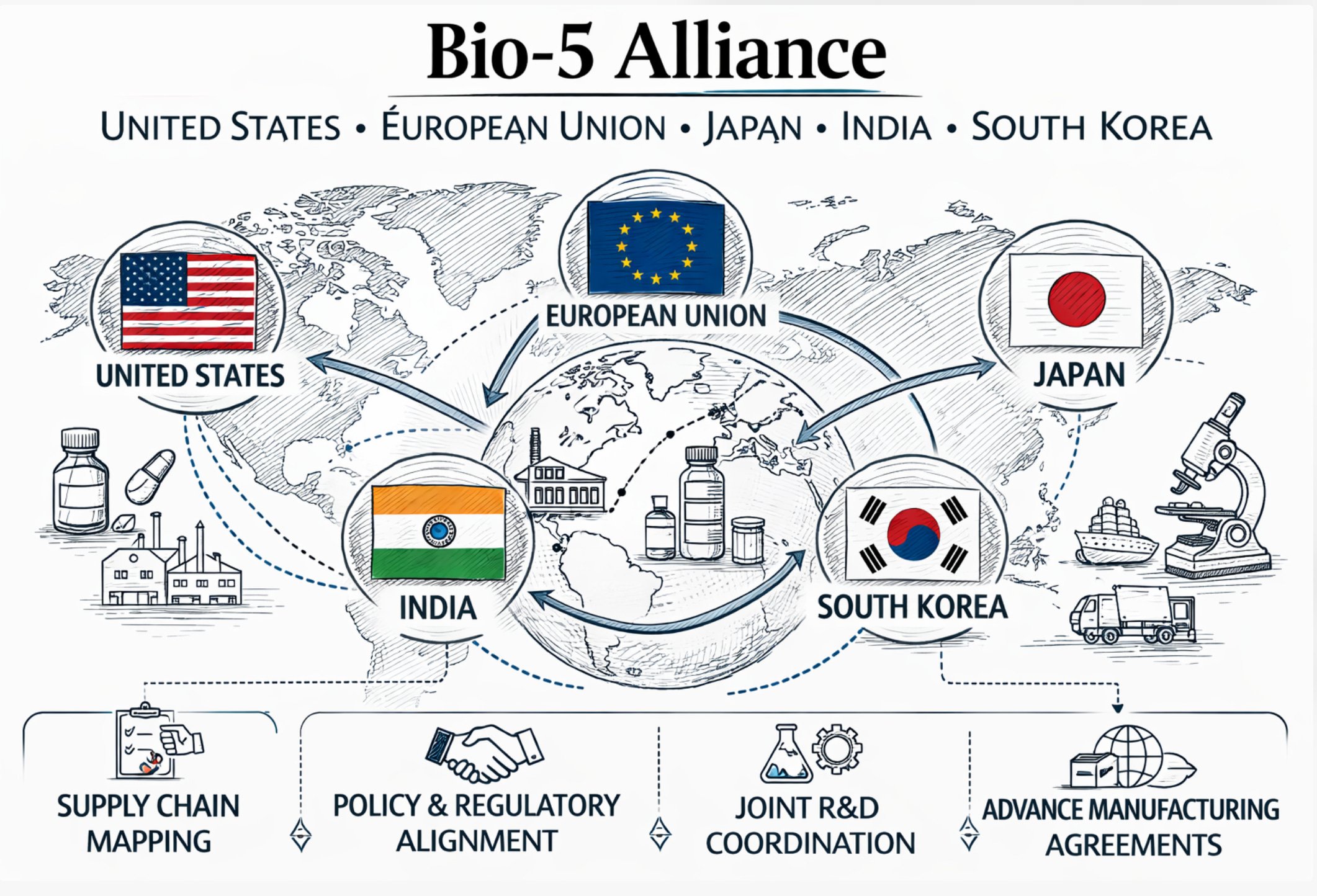 The Bio-5 Alliance’s political structure operates on a track 1.5 format, meaning that government officials and private industry representatives participate jointly, under the auspices of the NSC and OPPR on the U.S. side, with equivalent governmental counterparts from each member economy. This structure was chosen deliberately: supply chain resilience cannot be achieved by government mandates alone; it requires advance commitments from the pharmaceutical manufacturers, contract development and manufacturing organizations, and raw material suppliers who would actually execute diversified production arrangements. The format gives governments and industry a shared forum to align policy incentives with commercial investment decisions before a crisis makes that alignment urgent.