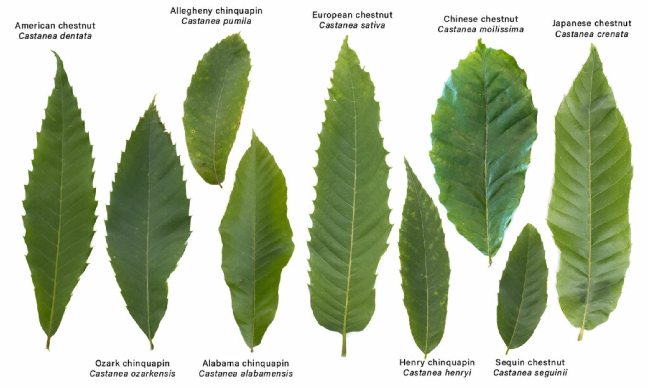 For those interested, below is a chart comparing the leaves of the various chestnuts, followed by a chart comparing the nuts (the American nut is considered sweeter, but the Chinese has a larger nut, which is easier to harvest).