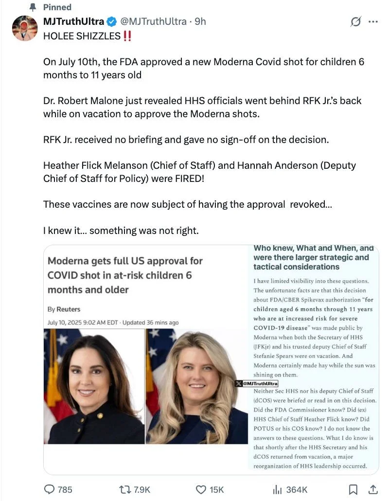 The narrative on MAHA Twitter after the FDA approved Moderna’s SPIKEVAX vaccine for high-risk children is that this was a betrayal by Secretary Kennedy. But this is the OPPOSITE of what transpired. The Secretary was on vacation and not even briefed on the decision. It was a working vacation, and I have personal confirmation that he took many calls, briefings, and was constantly managing strategic and tactical decisions during his much-needed and well-earned vacation. He (and his beloved wife) have not had a vacation since launching his Presidential campaign.