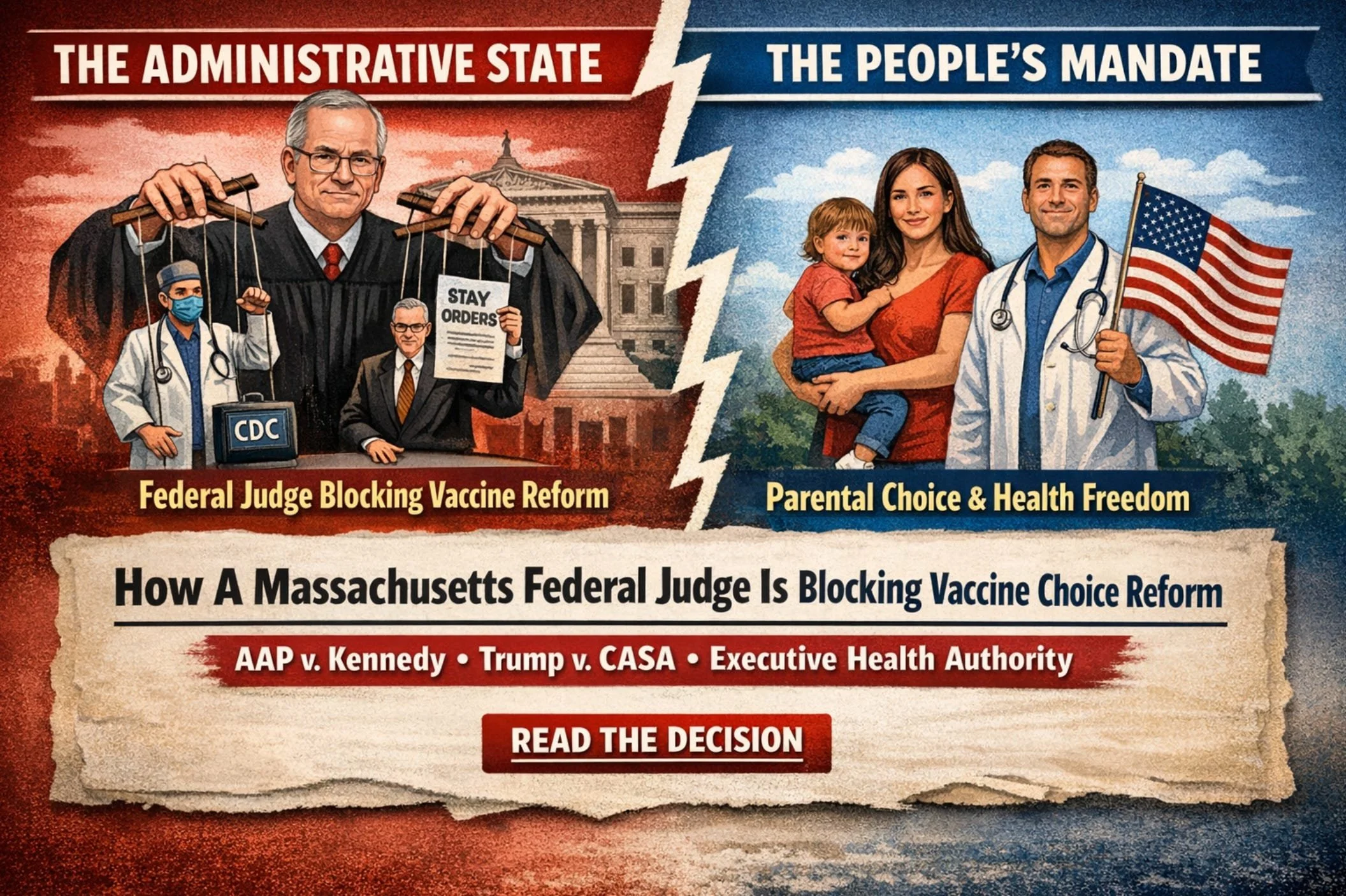 Today, a federal district court in Massachusetts issued a sweeping preliminary injunction against the Department of Health and Human Services, effectively freezing the most significant effort to reform America’s childhood vaccine schedule in a generation. Judge Brian Murphy’s ruling in American Academy of Pediatrics v. Kennedy (Civil Action No. 25-11916-BEM) represents precisely the kind of activist judicial intervention that the Supreme Court warned against in Trump v. CASA (2025) -- and it deserves serious scrutiny from anyone who believes in democratic accountability over administrative entrenchment.