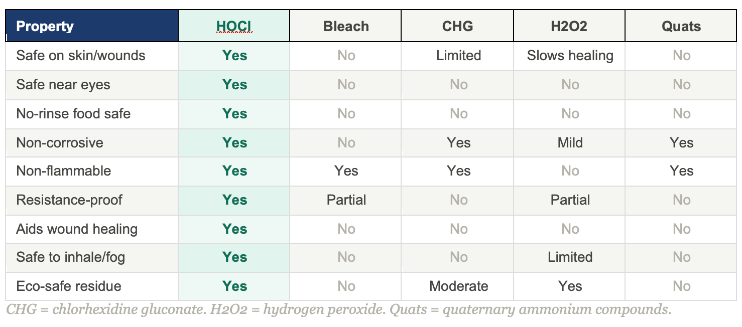 Most households rotate among a small collection of cleaning and disinfecting products: bleach-based sprays, alcohol-based sanitizers, chlorhexidine wipes, hydrogen peroxide cleaners, and quaternary ammonium disinfectants. Here is how HOCl compares across the properties that actually matter: