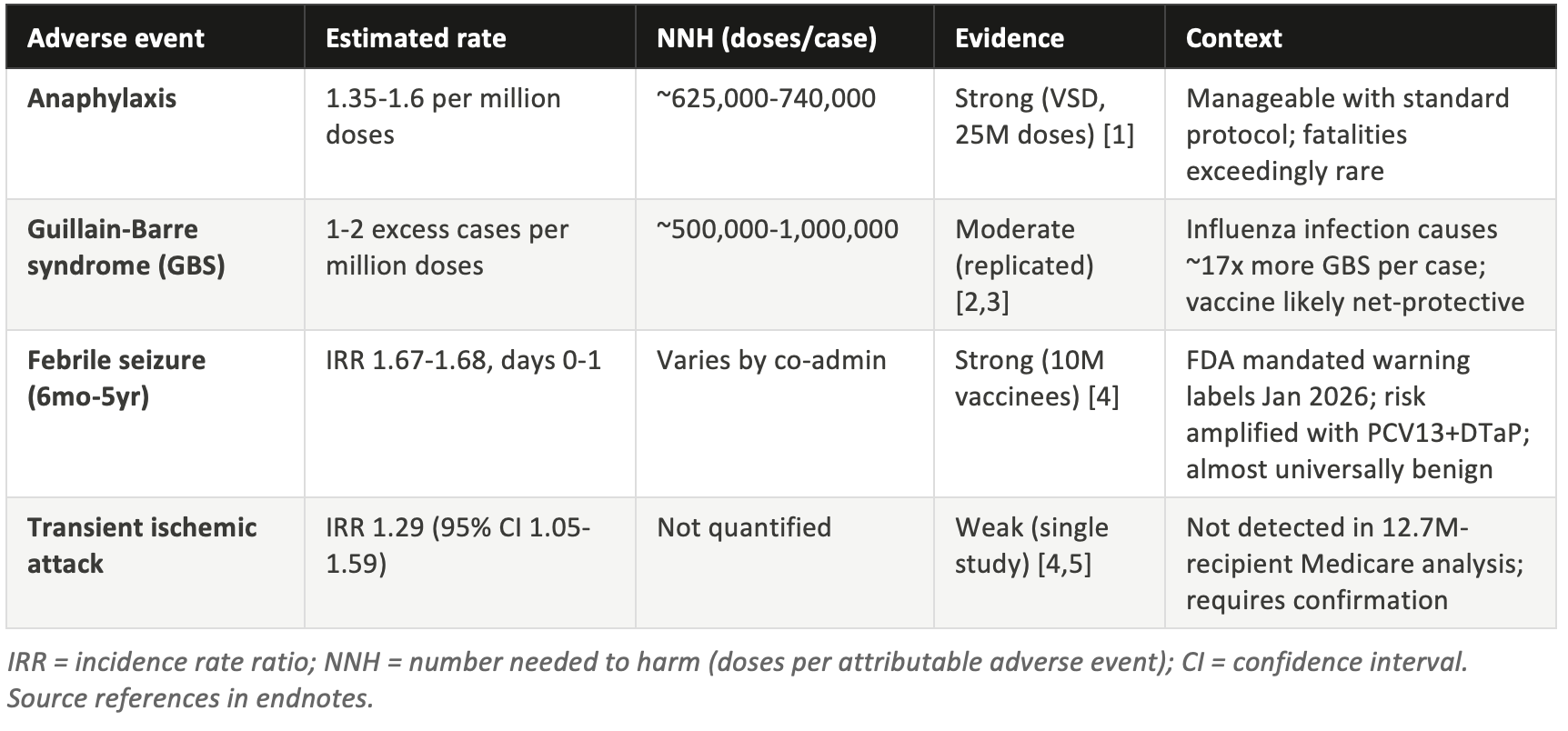 As detailed above, the VSD likely underestimates adverse event rates in lower-SES populations, FluSurv-NET likely underestimates hospitalization burden (making the NNV calculations conservative), and VAERS is not suitable for incidence estimation. A well-calibrated reading of the evidence requires awareness of where these biases push the estimates, not just confidence that the aggregate numbers are approximately right.