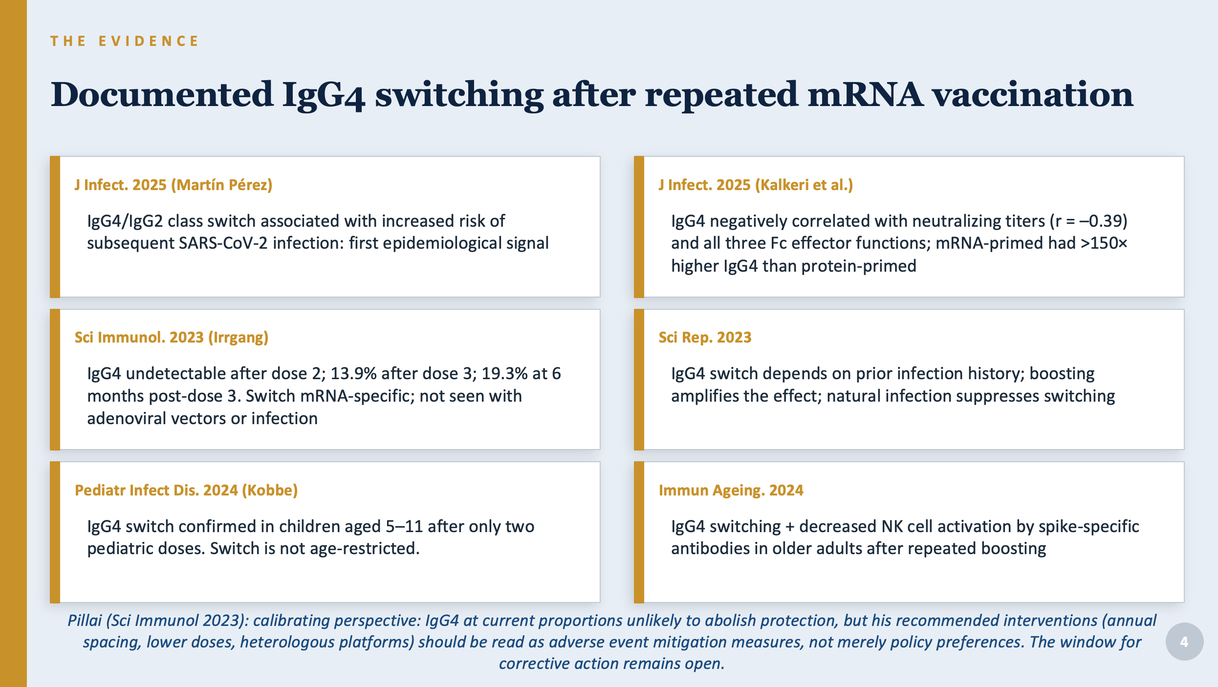 The findings for children are particularly concerning. Children face near-zero individual risk of severe COVID. The documented justification for vaccinating them rested almost entirely on reducing transmission to others. But the IgG4 shift produces an antibody profile that is poorly suited to preventing infection and transmission. And the shift occurs after only two standard pediatric doses, before any booster is even given.