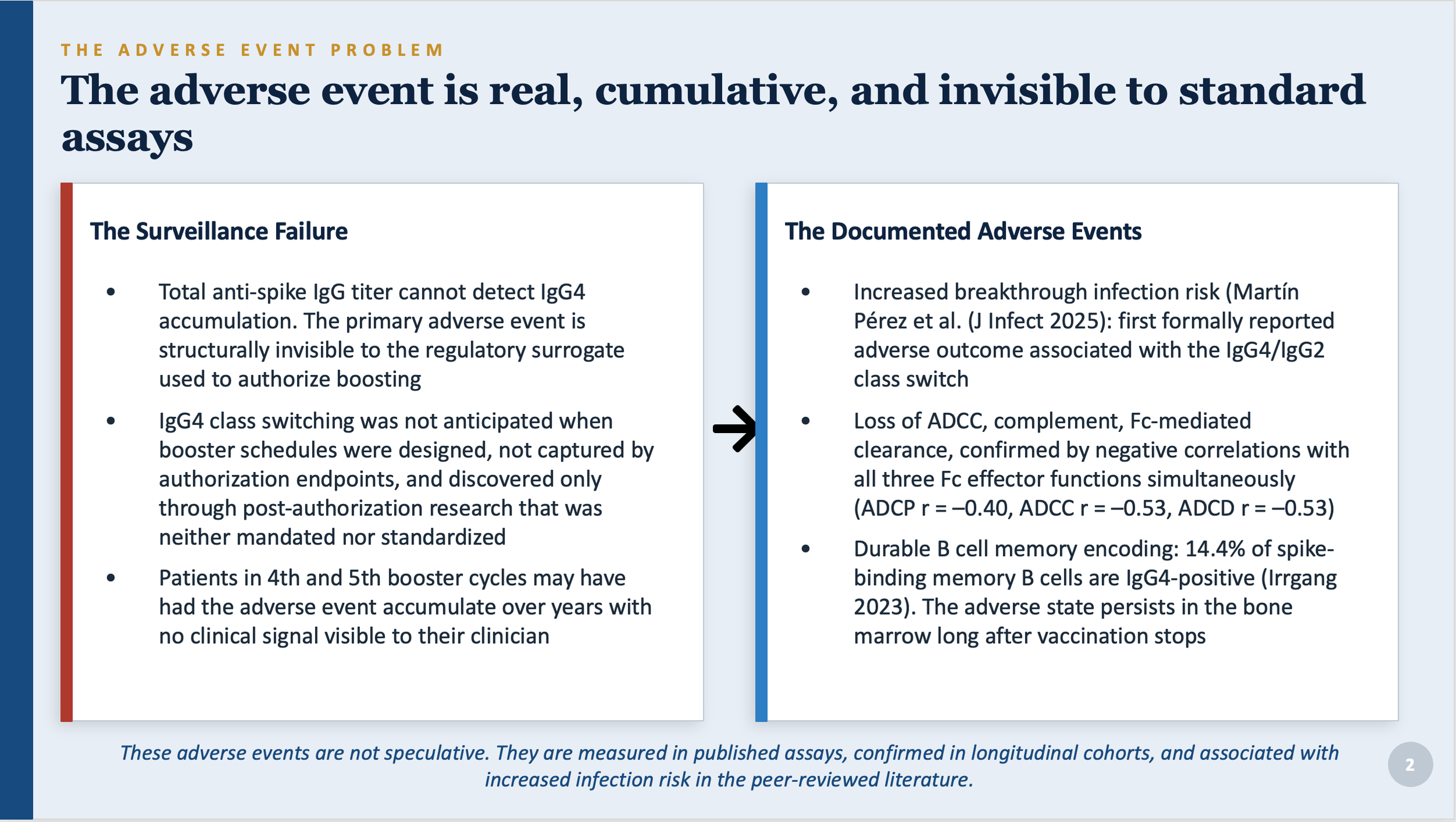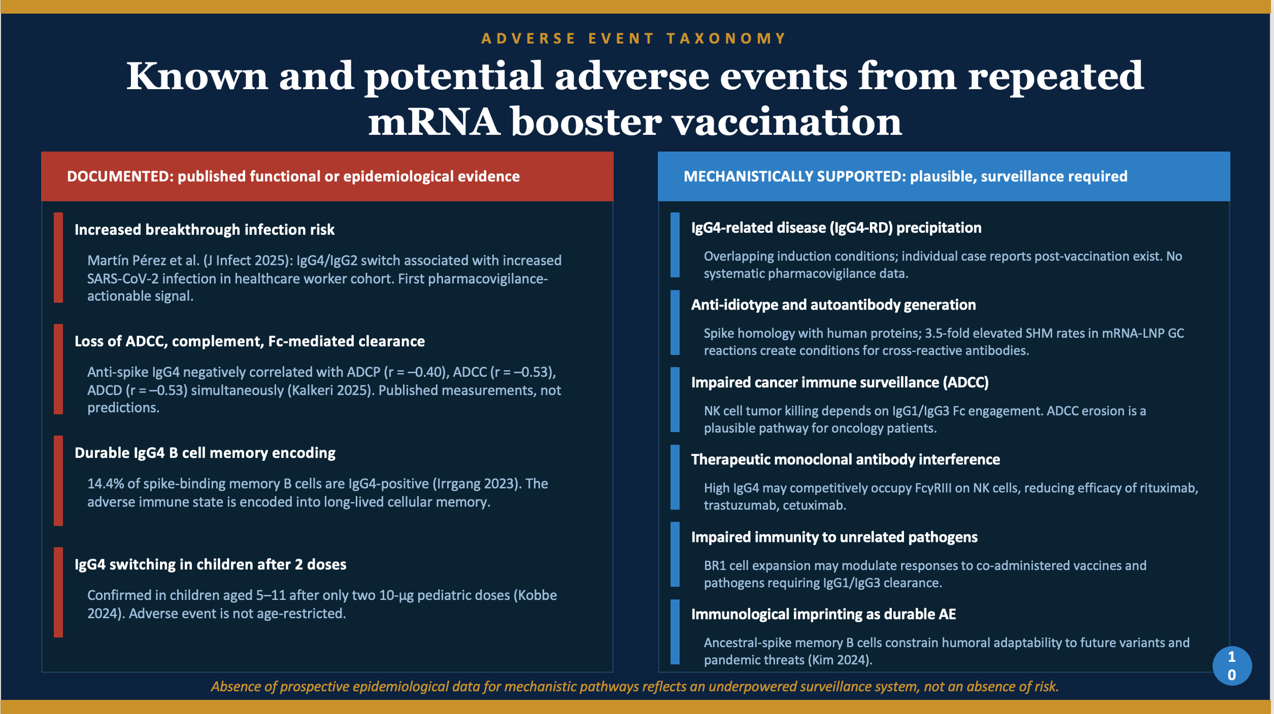 • Start the surveillance studies that should have been started years ago. At minimum: prospective studies measuring COVID outcomes by IgG subclass composition; review of IgG4-related disease cases linked to vaccination; studies of outcomes in cancer patients on ADCC-dependent therapies who also received boosters; and long-term immune follow-up in children.