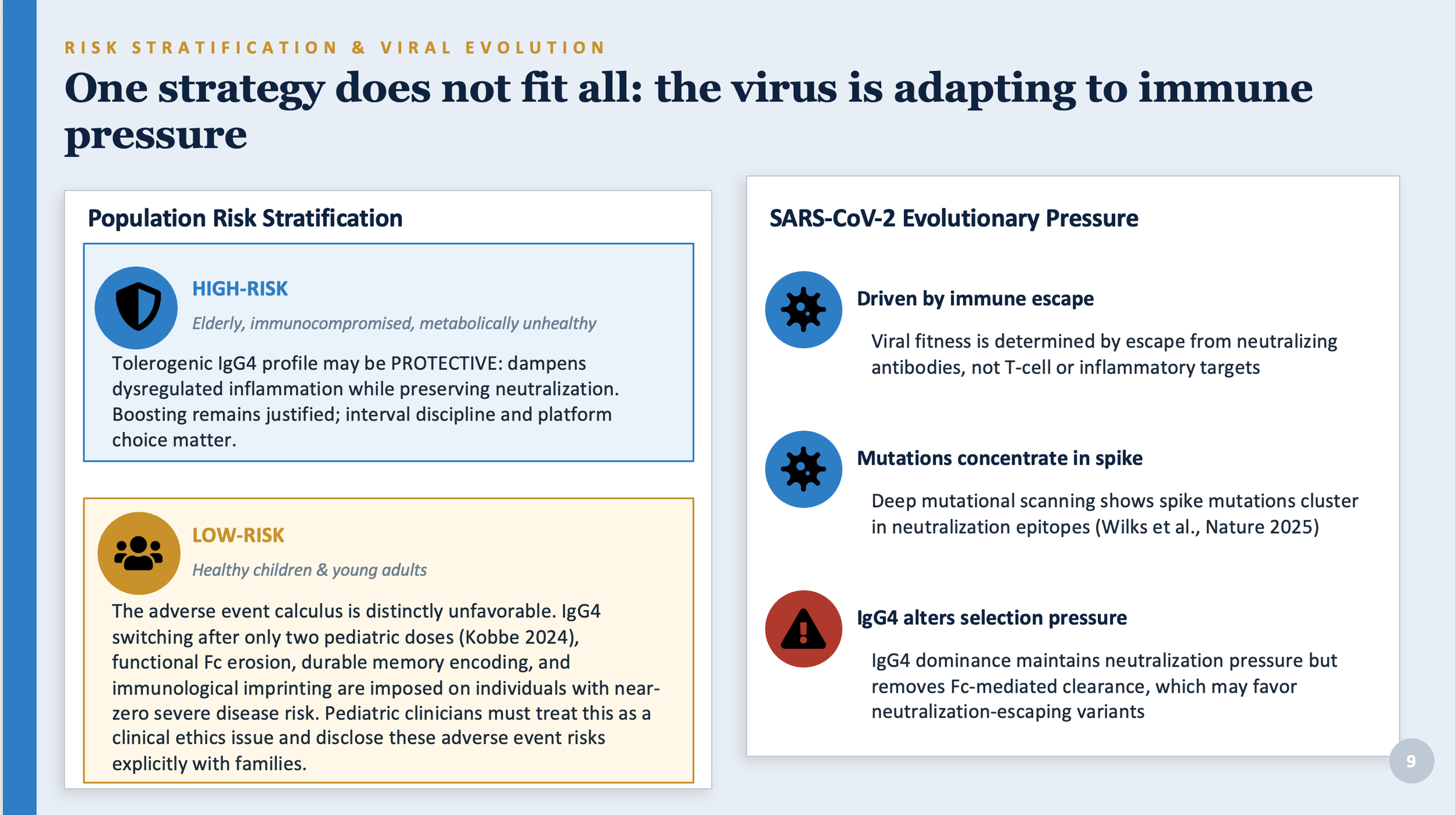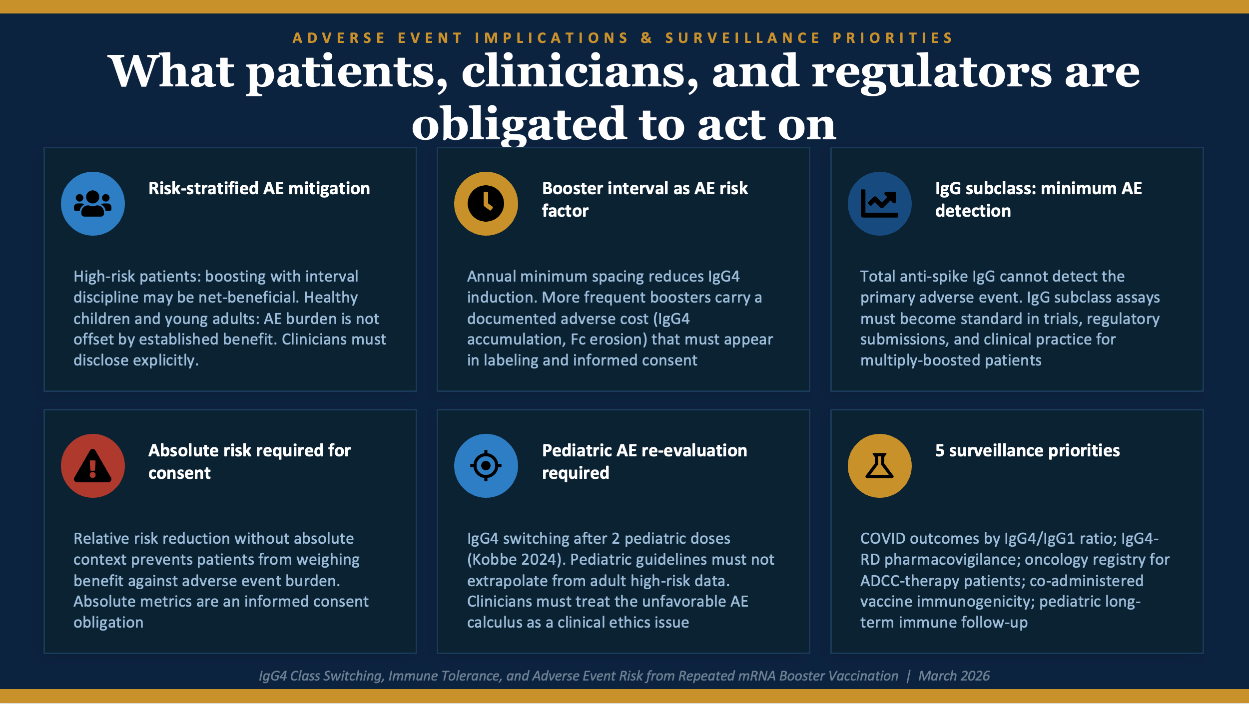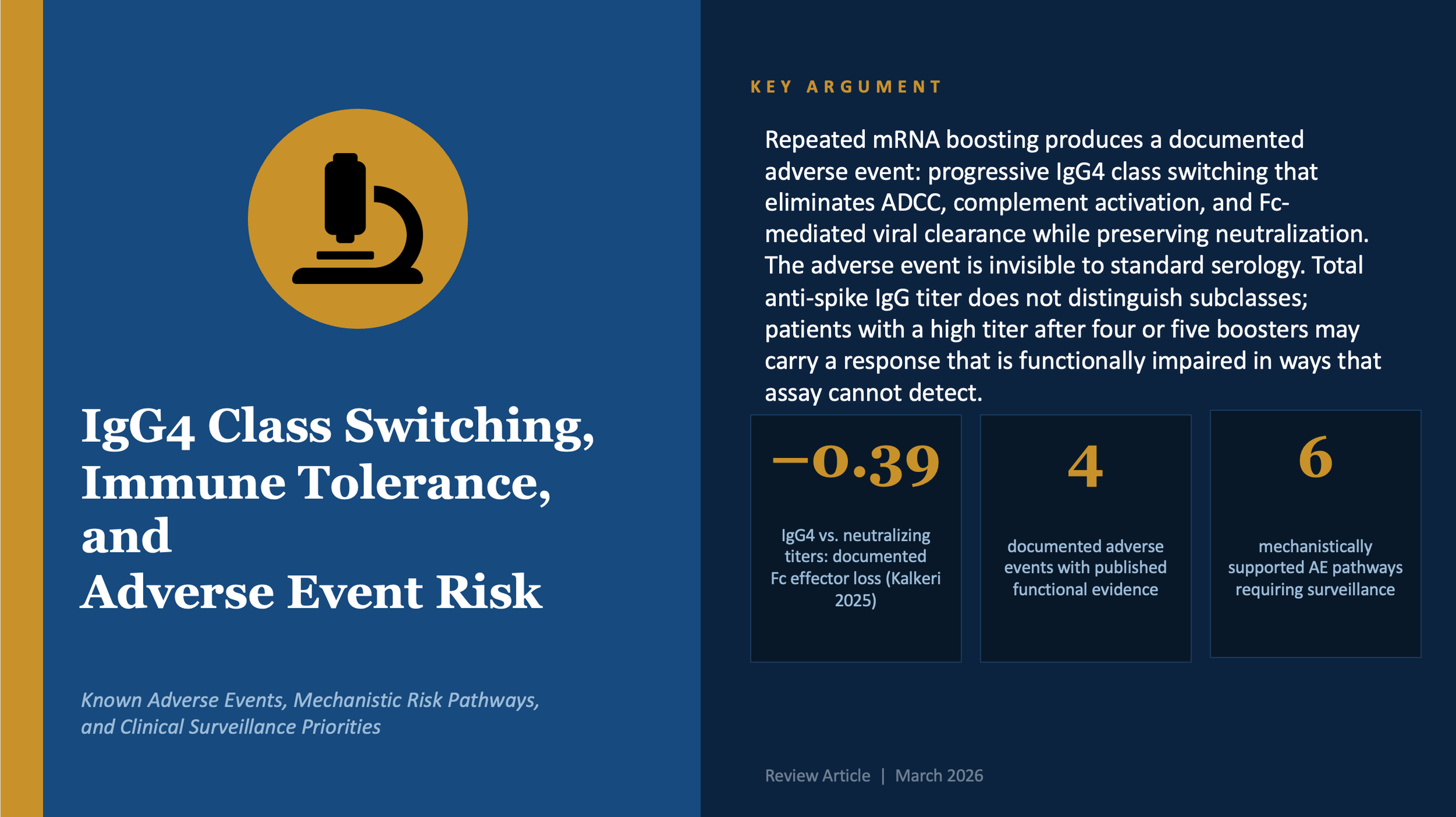 For healthy adults who are not at elevated risk of severe COVID, the calculation is different. The individual risk of serious illness is very low. The benefits of additional boosters are small in absolute terms. And the adverse immune events documented here (loss of Fc clearance function, durable IgG4 memory encoding, immunological imprinting) are not offset by a commensurate benefit. Clinicians advising this group have an obligation to explain these trade-offs, not to present continued boosting as obviously beneficial.