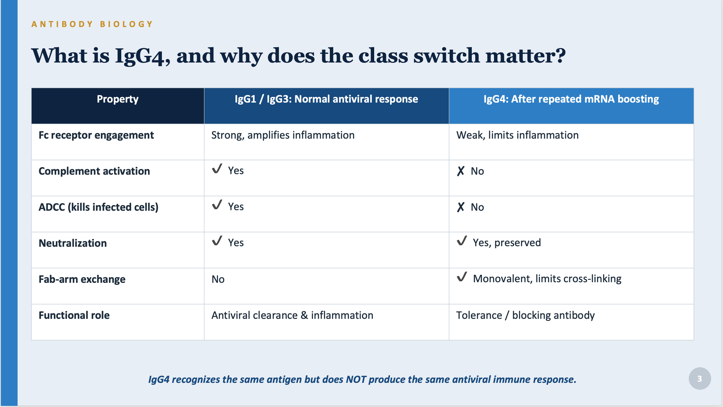 But something changes after a third dose, and in some case after the second dose, and becomes more pronounced with each additional dose. Multiple peer-reviewed studies now document that repeated mRNA boosting drives a progressive shift toward IgG4 in the antibody response specifically targeting the spike protein. This shift: