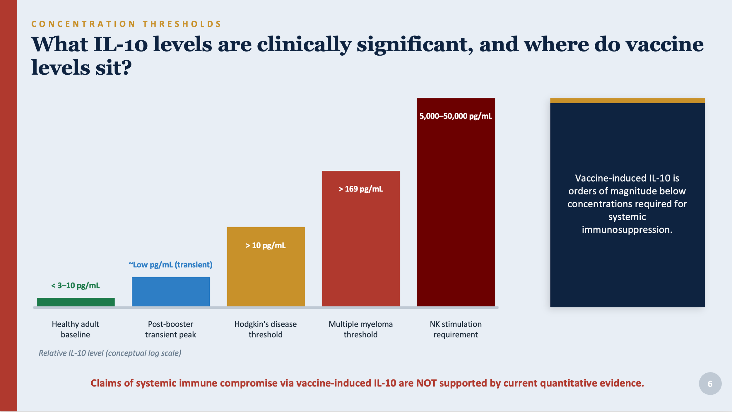 You may have read claims that COVID boosters suppress the immune system overall through elevated IL-10. This is not supported by the evidence. The quantities of IL-10 produced by vaccination are in the low picogram-per-milliliter range, tiny amounts that clear quickly. The levels required to suppress NK cells, impair T cell responses, or cause the kinds of immune dysfunction seen in cancer patients are thousands of times higher than what vaccination produces.