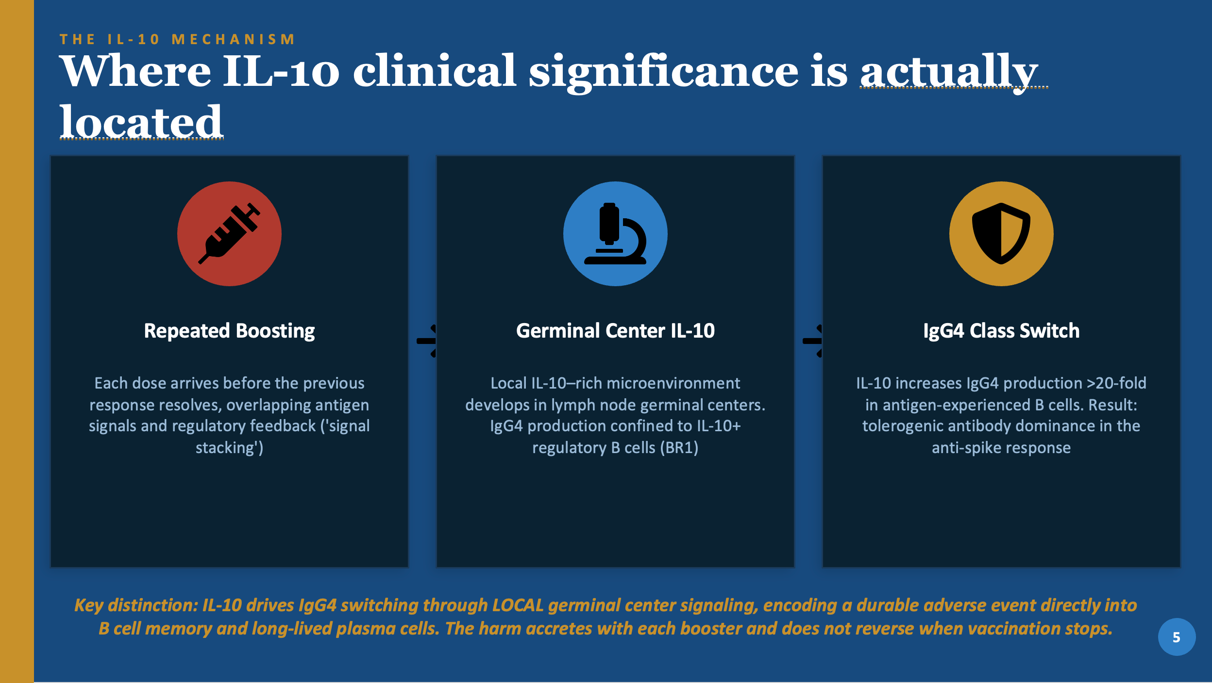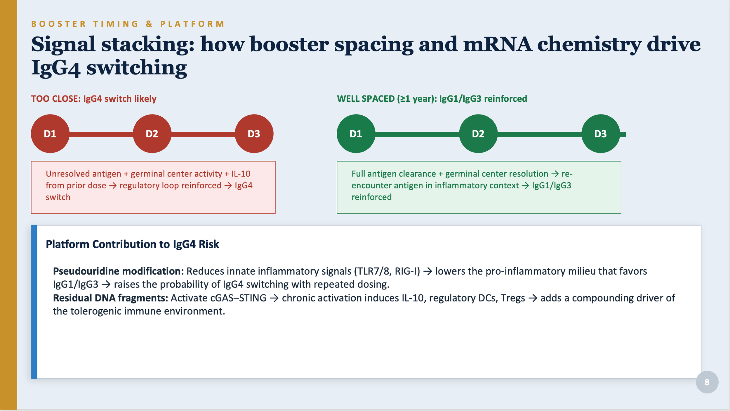 When boosters are given before the immune response to the previous dose has fully resolved, the signals overlap and amplify each other. This process is referred to as signal stacking. Each overlapping dose reinforces the IL-10 regulatory environment and pushes the IgG4 shift further. Boosters given at least a year apart allow the immune response to fully resolve and reset before re-exposure, reducing the probability of the IgG4 shift.