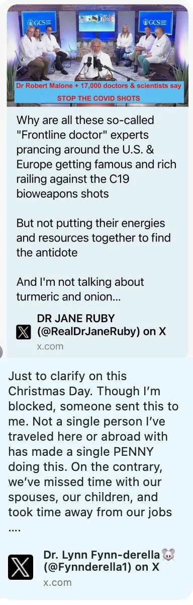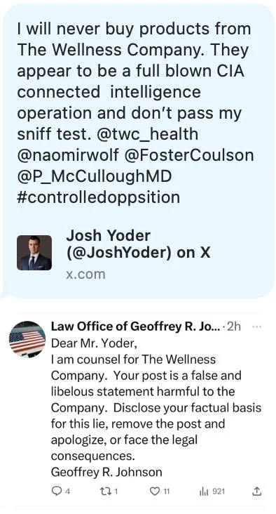 In the case of Paul Alexander, in my opinion it is clear that his support for these activities comes from Foster Colson’s “The Wellness Company” TWC ads are often displayed on Alexander’s attack posts. Alexander never promoted anti-Malone hate until hired by Wellness, and his accusations have followed the hate narratives promoted by Wellness CEO Foster Colson in his 2022 Christmas letter.